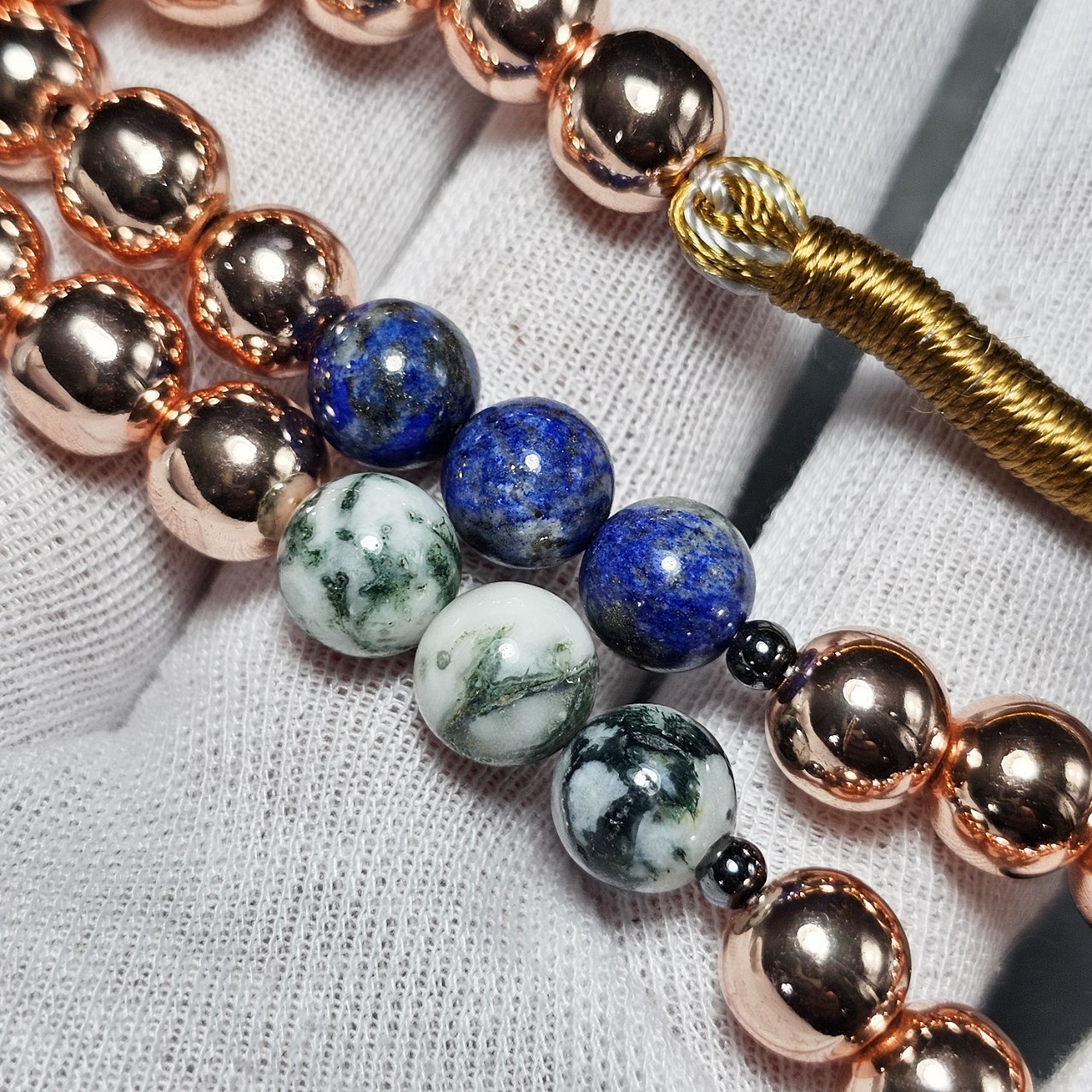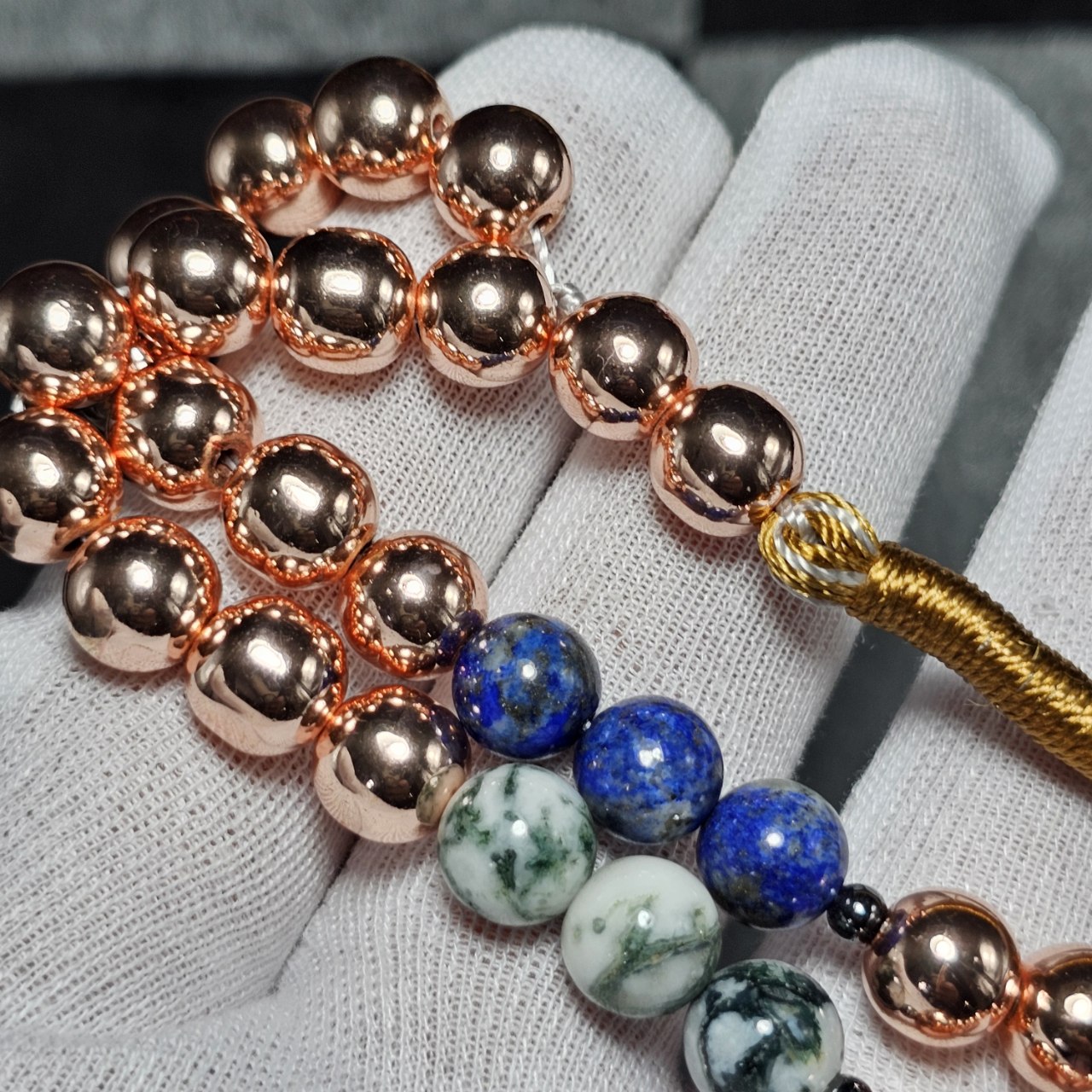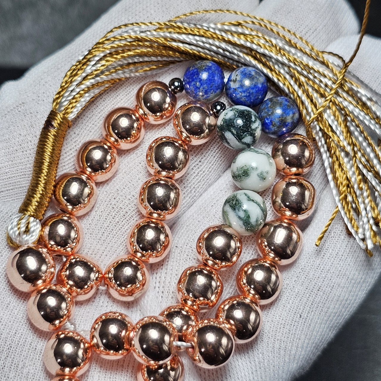 تسبیح ۳۳ دانه سنگ ماه تولد معدنی ( حدید - لاجورد - عقیق خزه ای) ▪️قطر دانه ها : ۸ میلیمتر ▪️وزن : ۵۳ گرم
